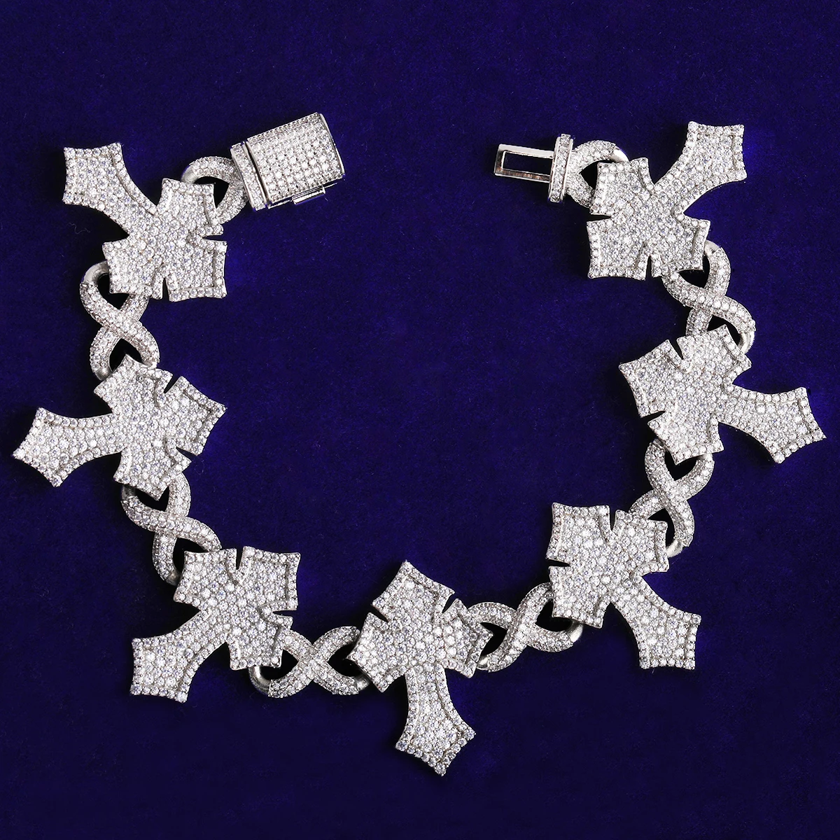 Unleash your boldest self with the Passion Cross bracelet—a fearless statement piece that commands attention. Crafted with premium 5AA+ VVS cubic zirconia stones, each facet catches light with an icy brilliance that rivals diamonds. The infinity link design symbolizes endless strength and resilience, while the iconic cross pendant channels spiritual power and unapologetic confidence. Flooded with crystalline sparkle from wrist to clasp, this bracelet transforms any look into a declaration of dominance. Perfect for those who refuse to blend in.